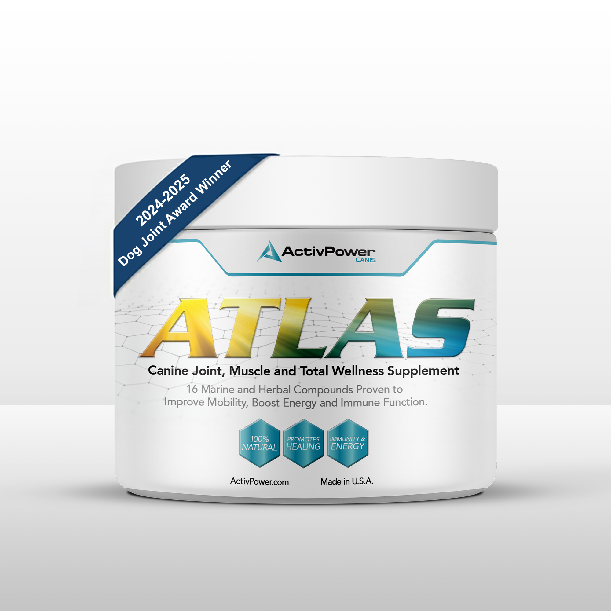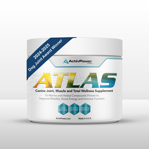 The revolutionary Atlas from ActivPowerCANIS is the only animal muscle and joint supplement of its kind. Our patented formula blends 16 all-natural ingredients that are rich in nutrients, vitamins and minerals with proven abilities to improve hip, back and joint mobility, restore energy and boost immunity in active and older dogs so they can live life at full power.